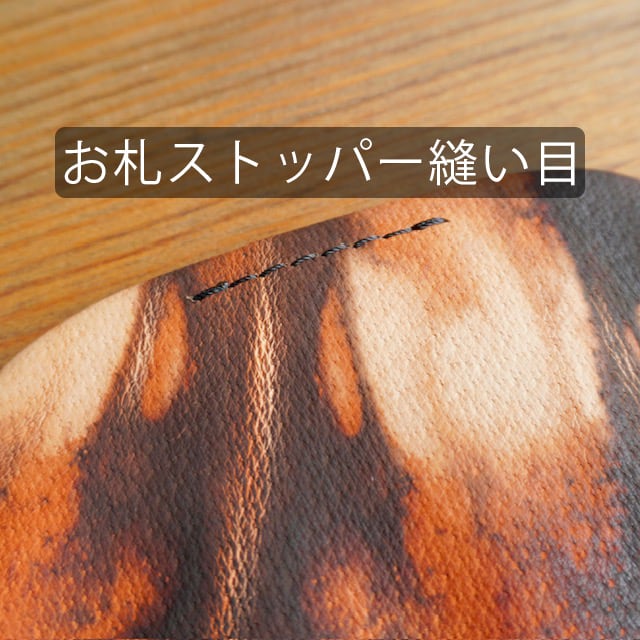 通常は、内装と外装を合わせ付けする前に、お札ストッパーを内装に取り付けますが、内外等を合わせた後にお札ストッパーを縫い付けたため、お札ストッパーの縫製が表面に出ています。