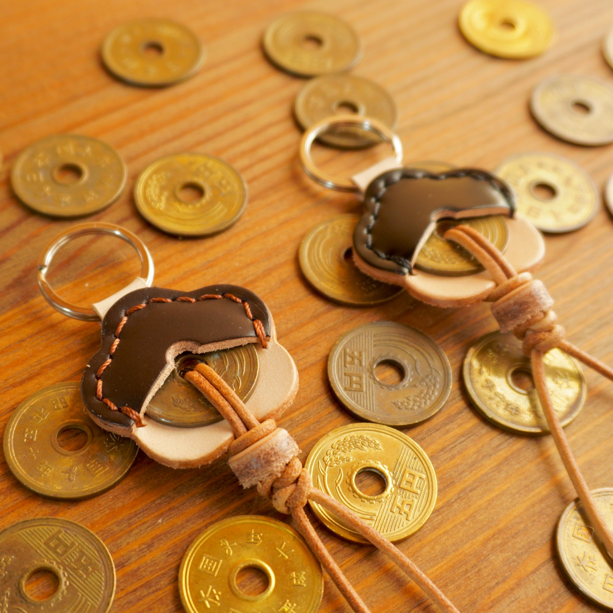5円=ご縁ホルダーとして、キーホルダーやバッグチャームにしたり、革紐を輪っか状に結び下げ二重リングに鍵などを取り付けてもご利用いただけます。