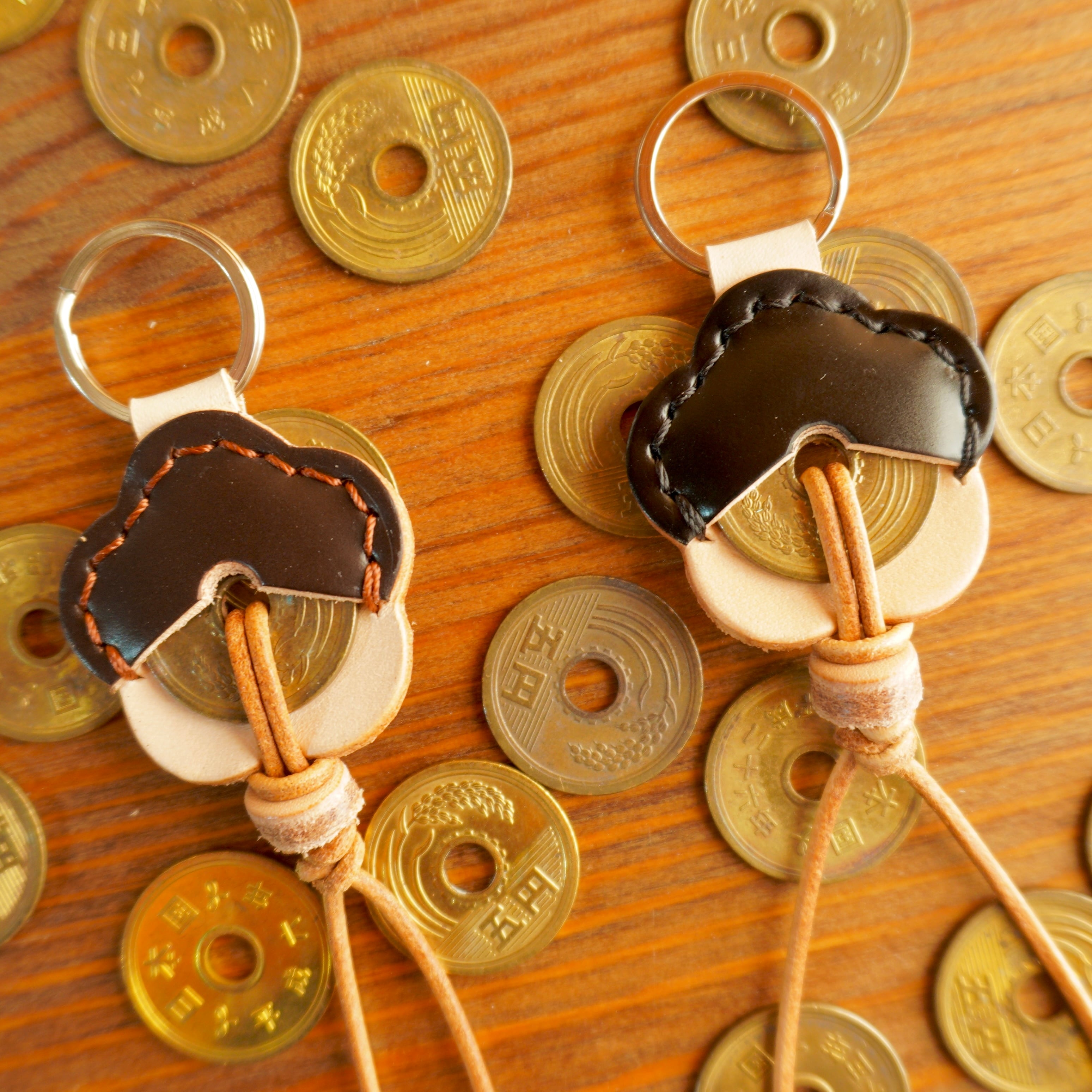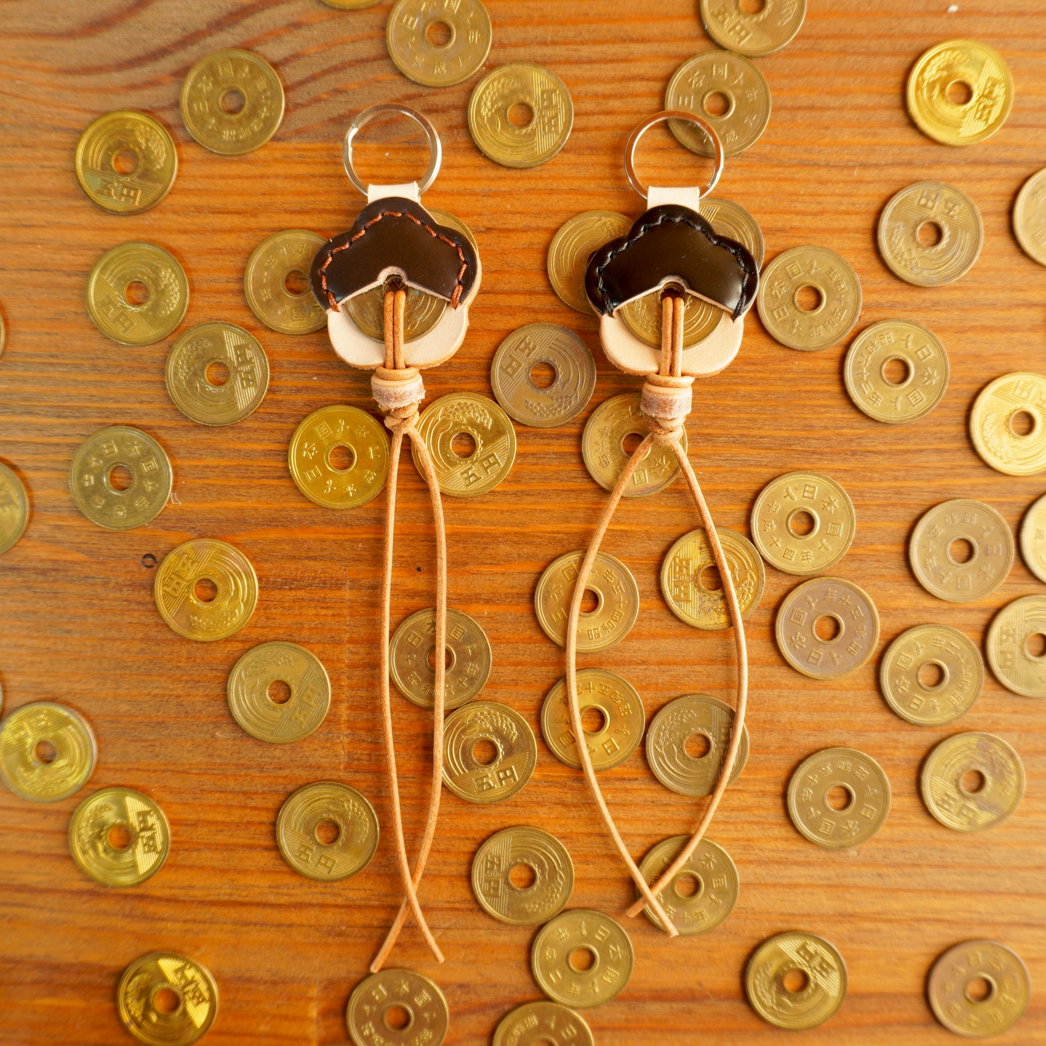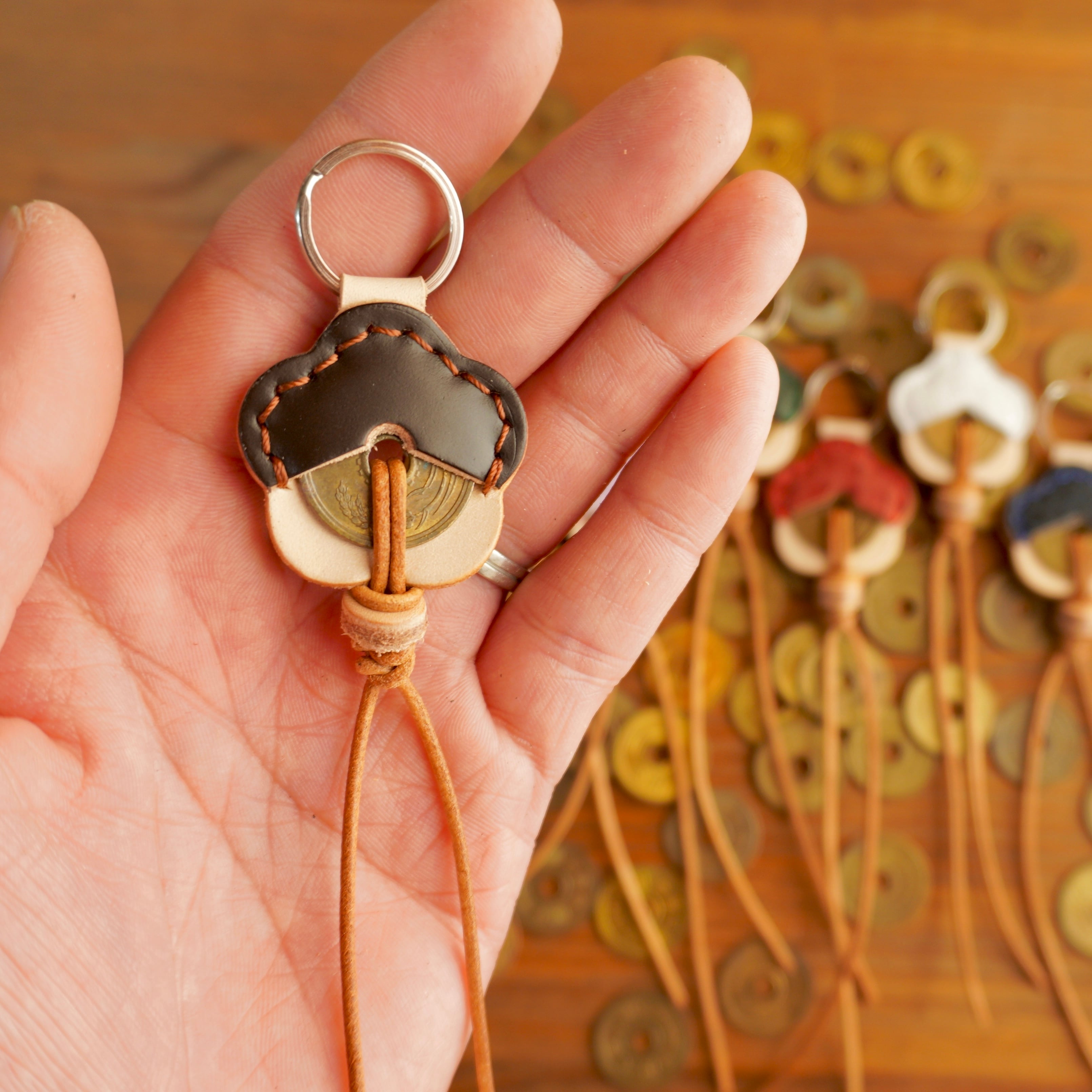 川越熊野神社の境内にある銭洗弁財天(写真参照)にてお清めした5円玉を「梅モチーフ」の革と馬革(コードバン)で包み、革ひもで結びました。