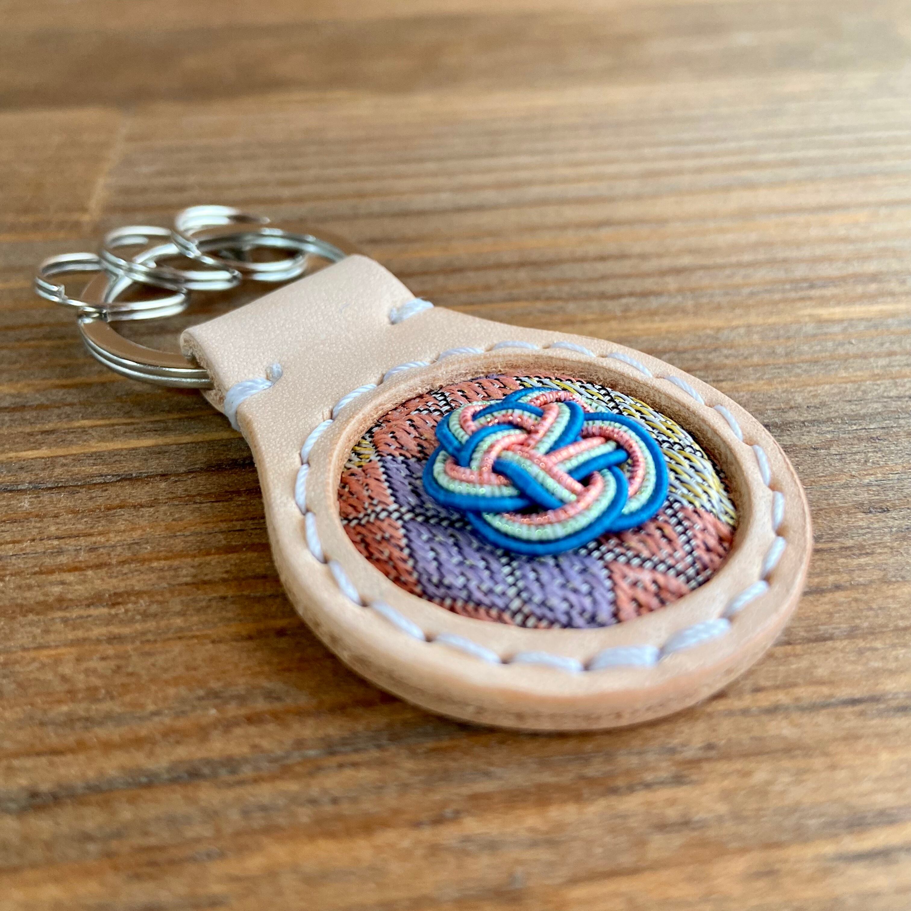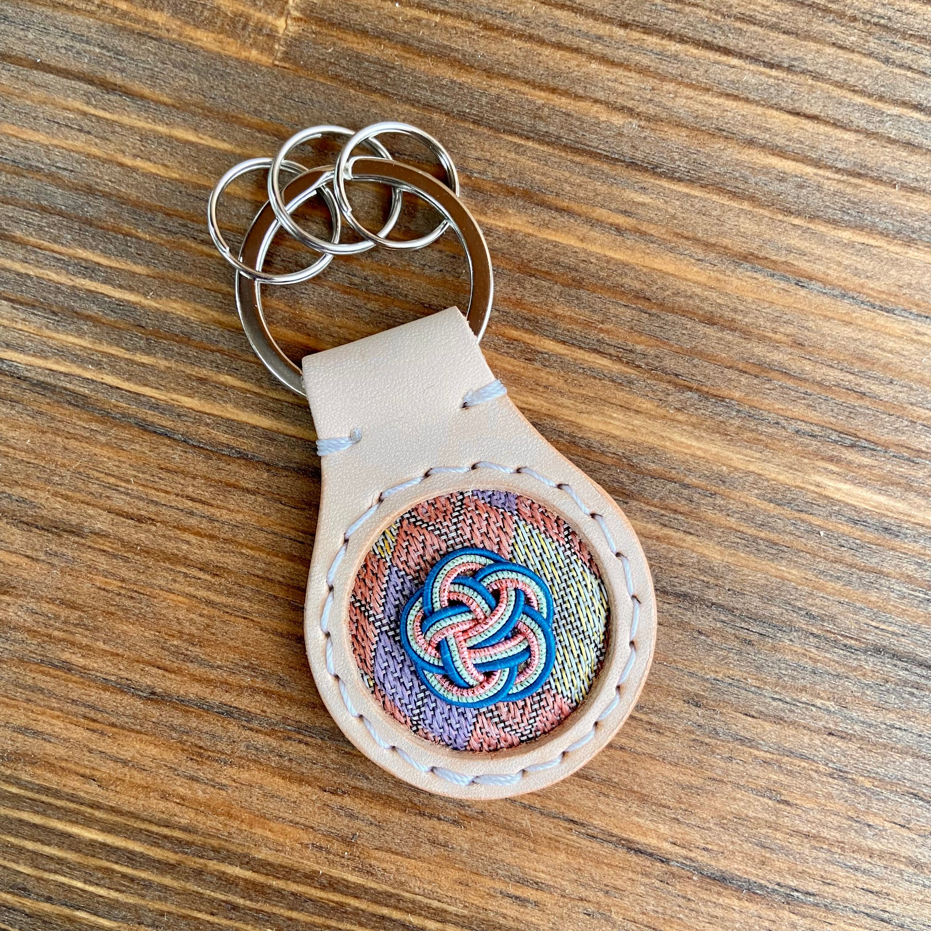 当工房の代表作【印鑑ケース】と同じ素材『姫路レザー×畳縁×水引』でお作りしたキーホルダーです。