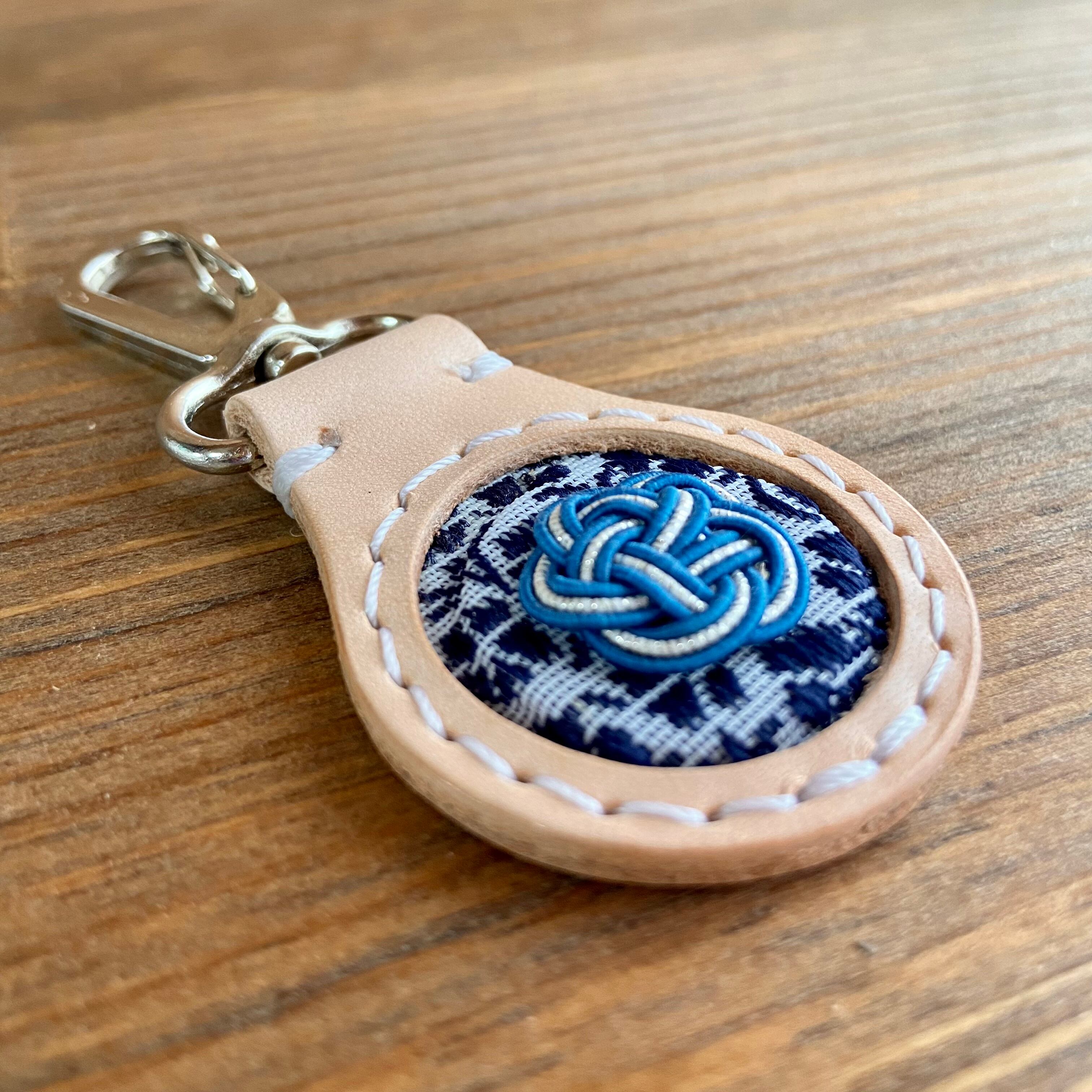 当工房の代表作【印鑑ケース】と同じ素材『姫路レザー×畳縁×水引』でお作りしたキーホルダーです。
