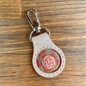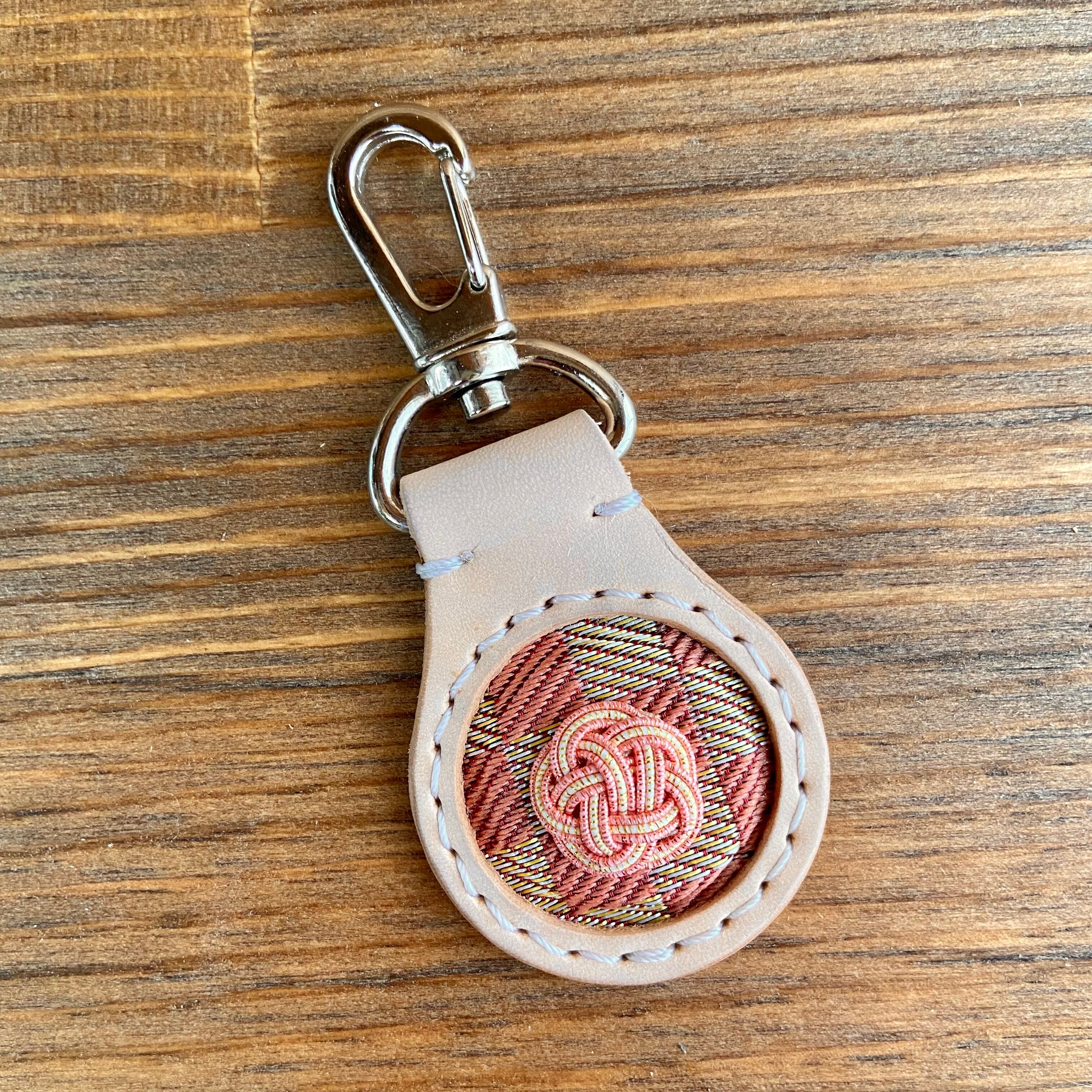 当工房の代表作【印鑑ケース】と同じ素材『姫路レザー×畳縁×水引』でお作りしたキーホルダーです。