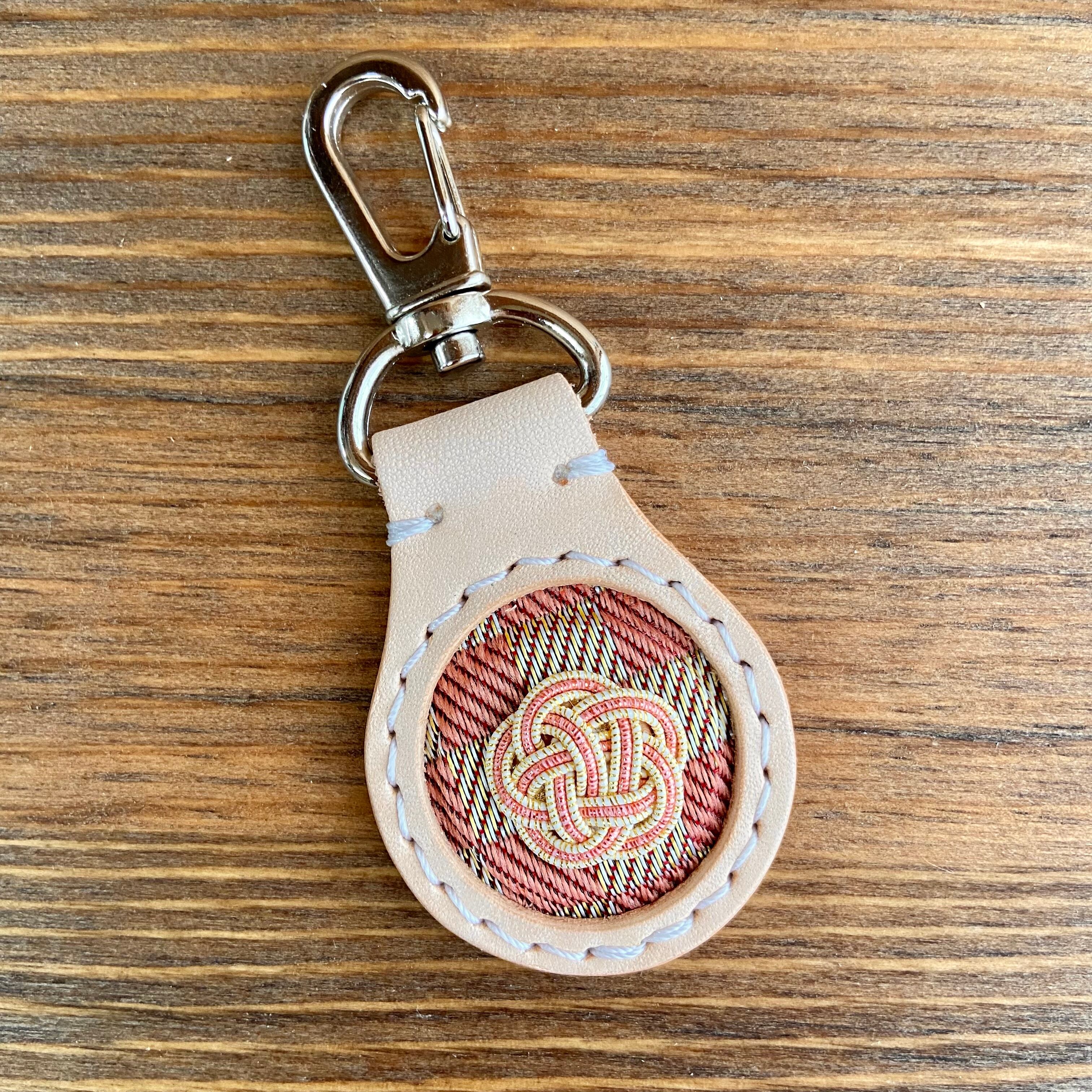 当工房の代表作【印鑑ケース】と同じ素材『姫路レザー×畳縁×水引』でお作りしたキーホルダーです。
