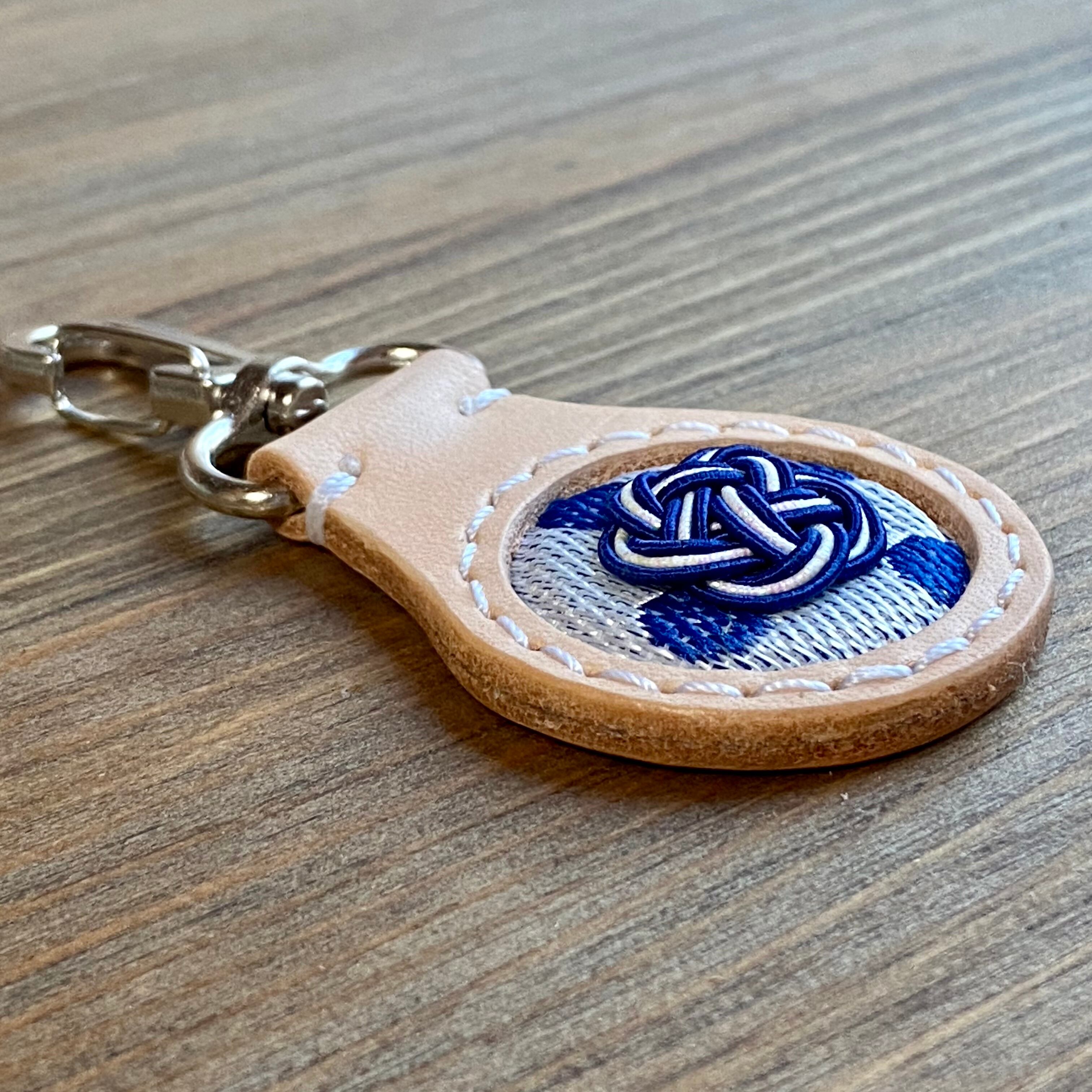 当工房の代表作【印鑑ケース】と同じ素材『姫路レザー×畳縁×水引』でお作りしたキーホルダーです。