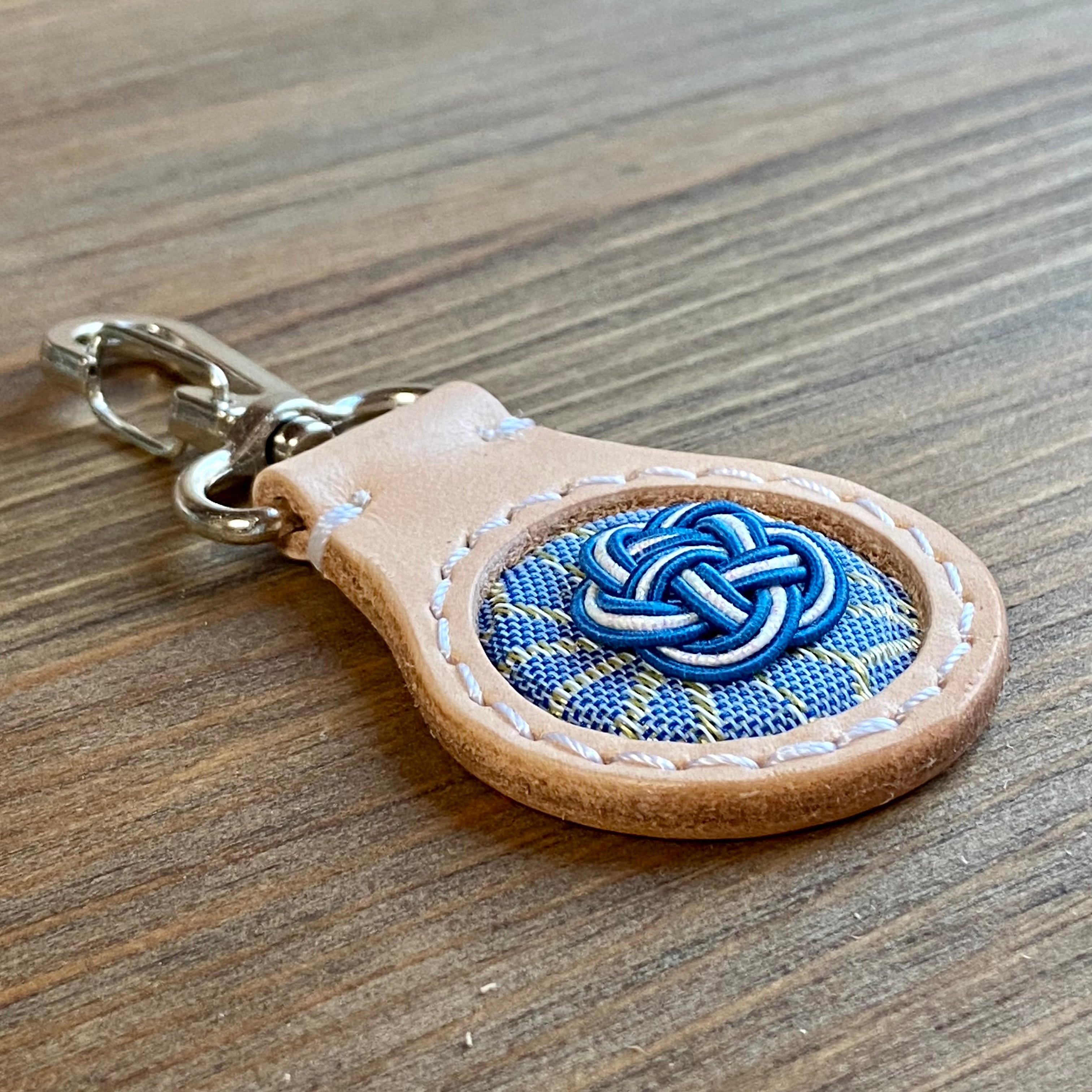 当工房の代表作【印鑑ケース】と同じ素材『姫路レザー×畳縁×水引』でお作りしたキーホルダーです。