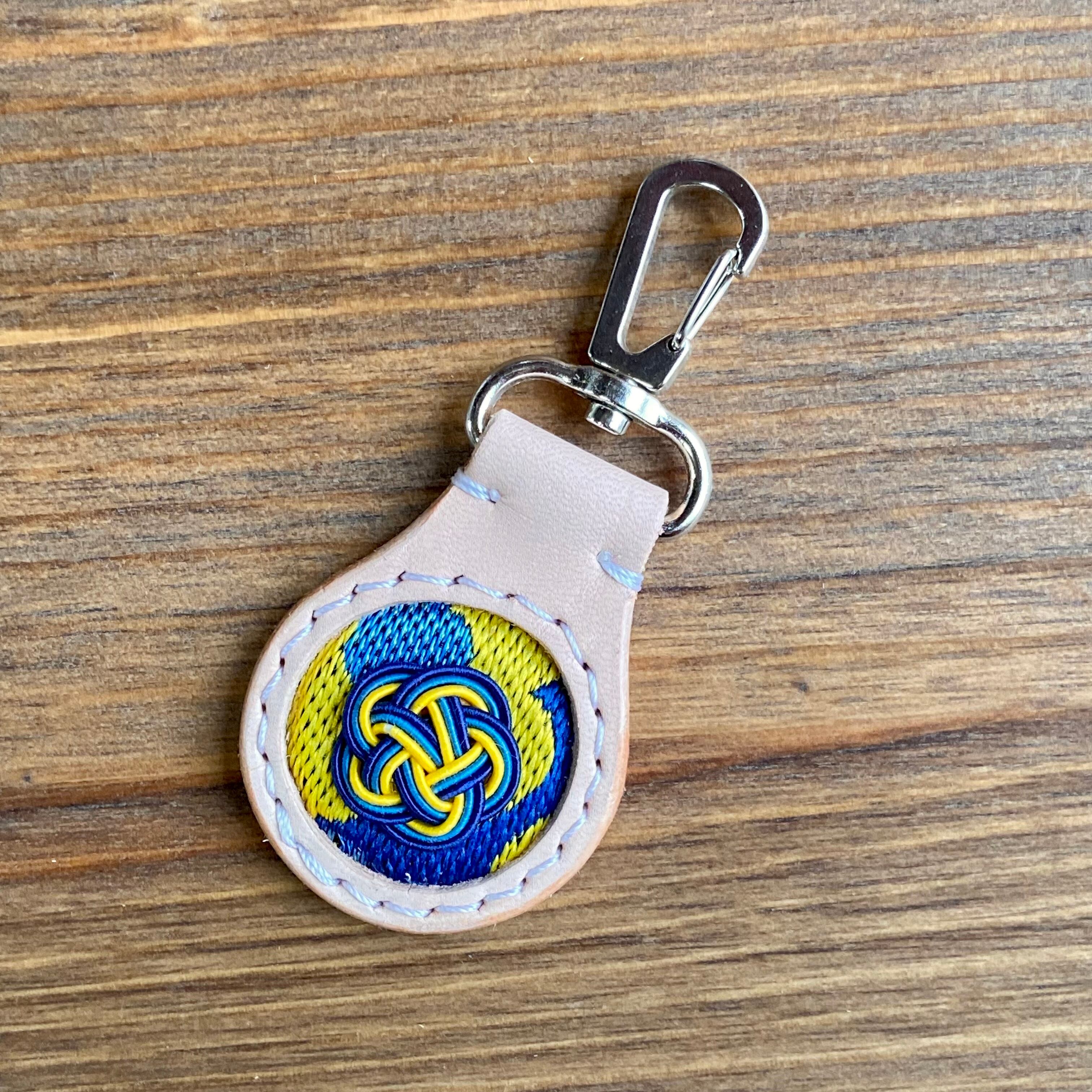 当工房の代表作【印鑑ケース】と同じ素材『姫路レザー×畳縁×水引』でお作りしたキーホルダーです。