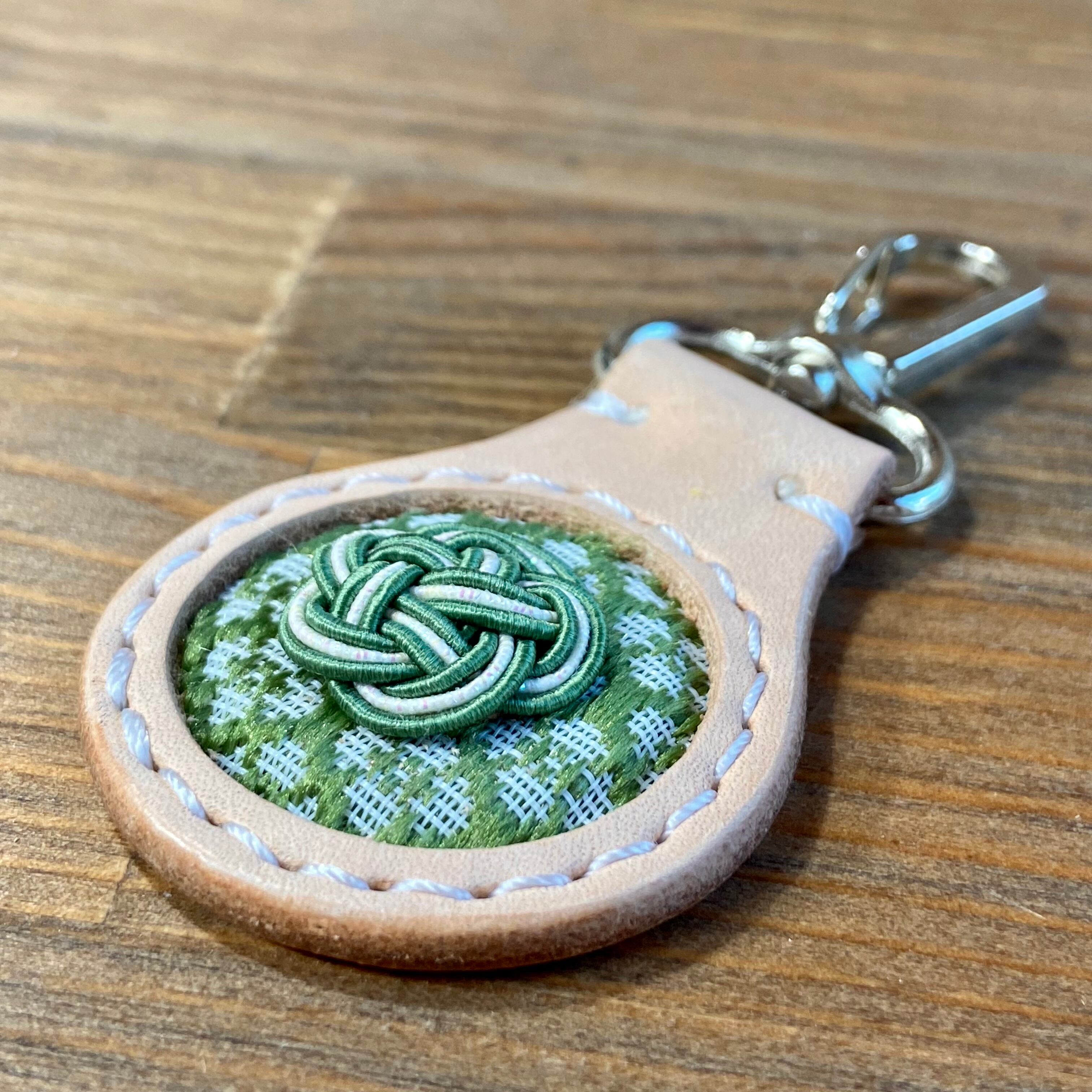 当工房の代表作【印鑑ケース】と同じ素材『姫路レザー×畳縁×水引』でお作りしたキーホルダーです。