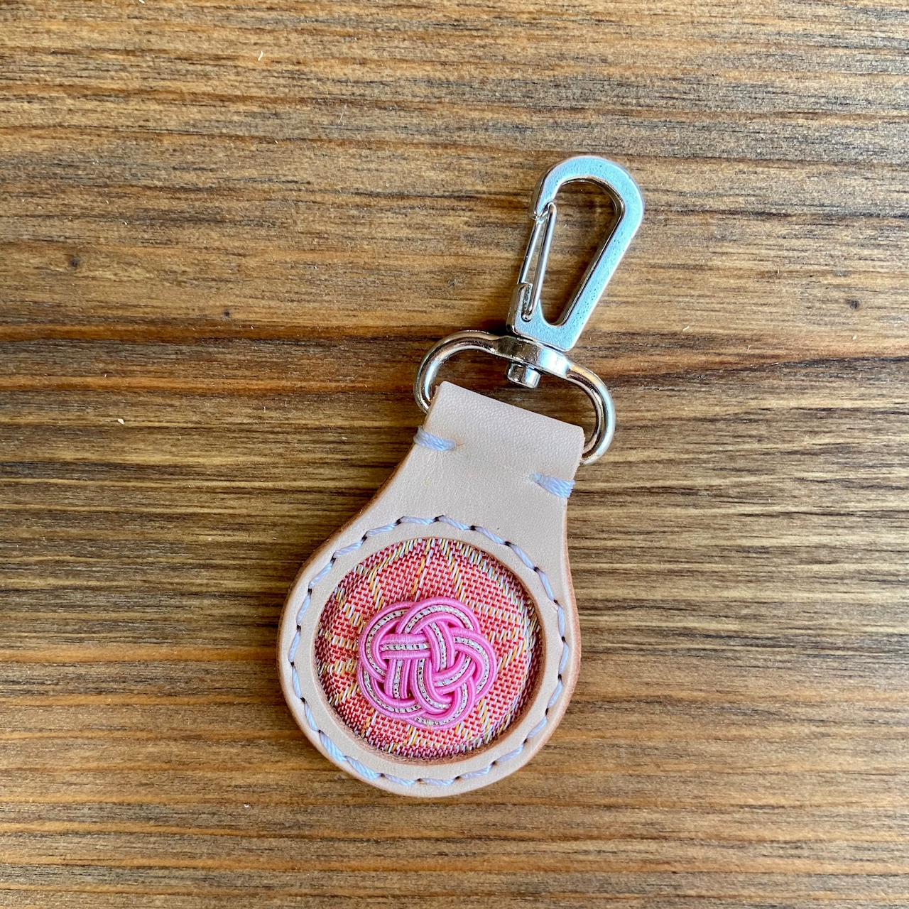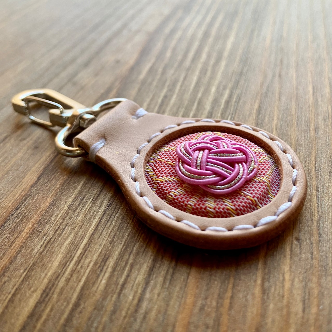 当工房の代表作【印鑑ケース】と同じ素材『姫路レザー×畳縁×水引』でお作りしたキーホルダーです。