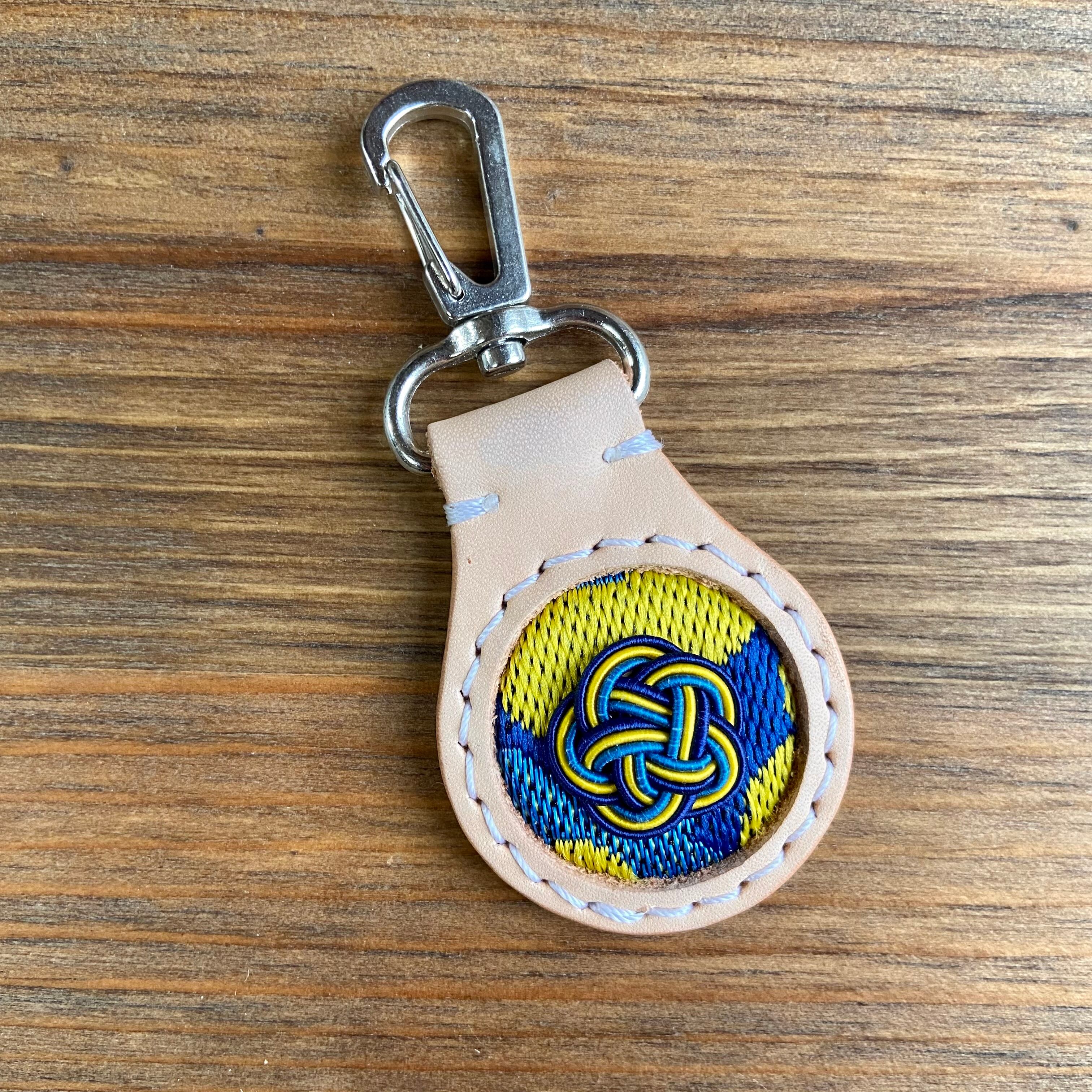 当工房の代表作【印鑑ケース】と同じ素材『姫路レザー×畳縁×水引』でお作りしたキーホルダーです。