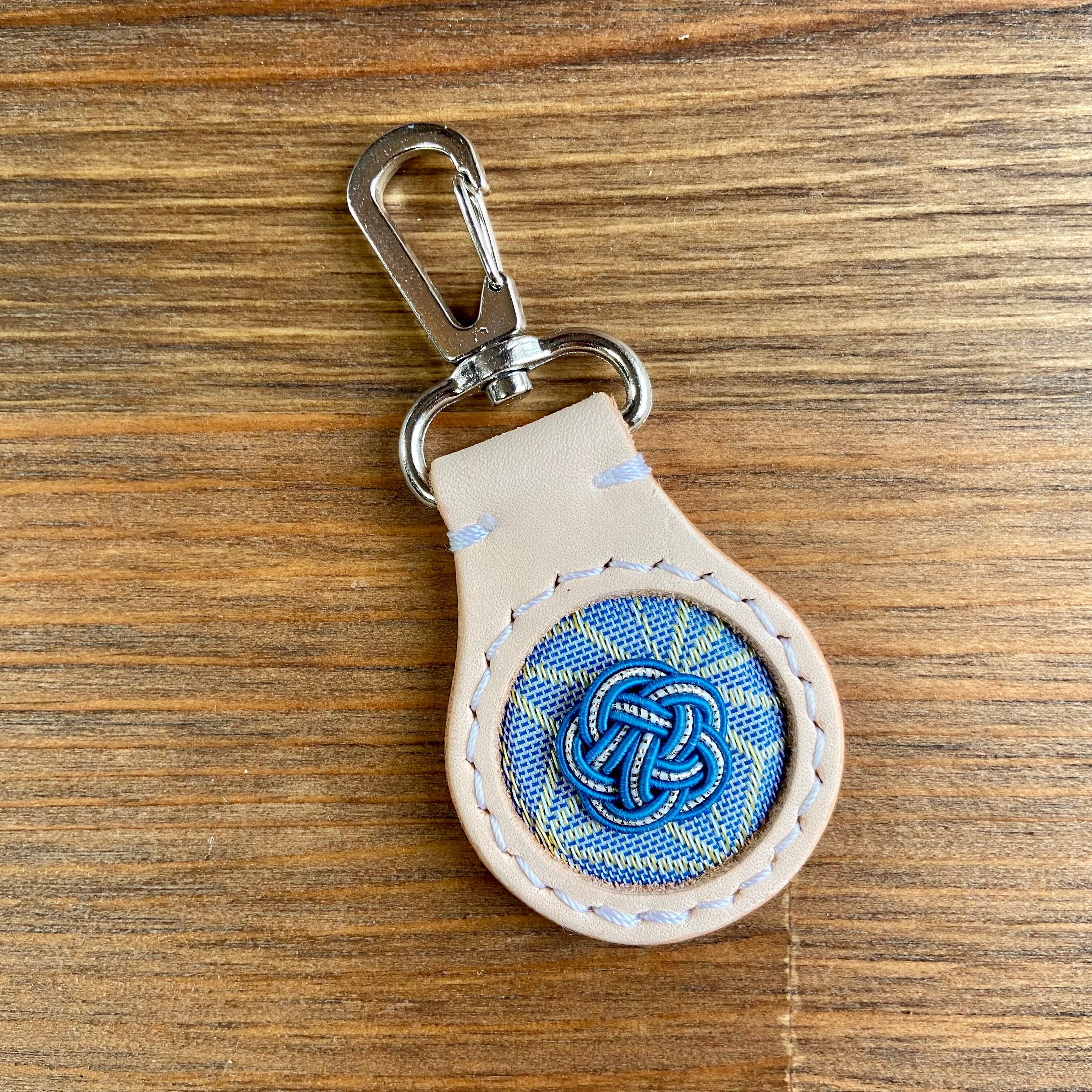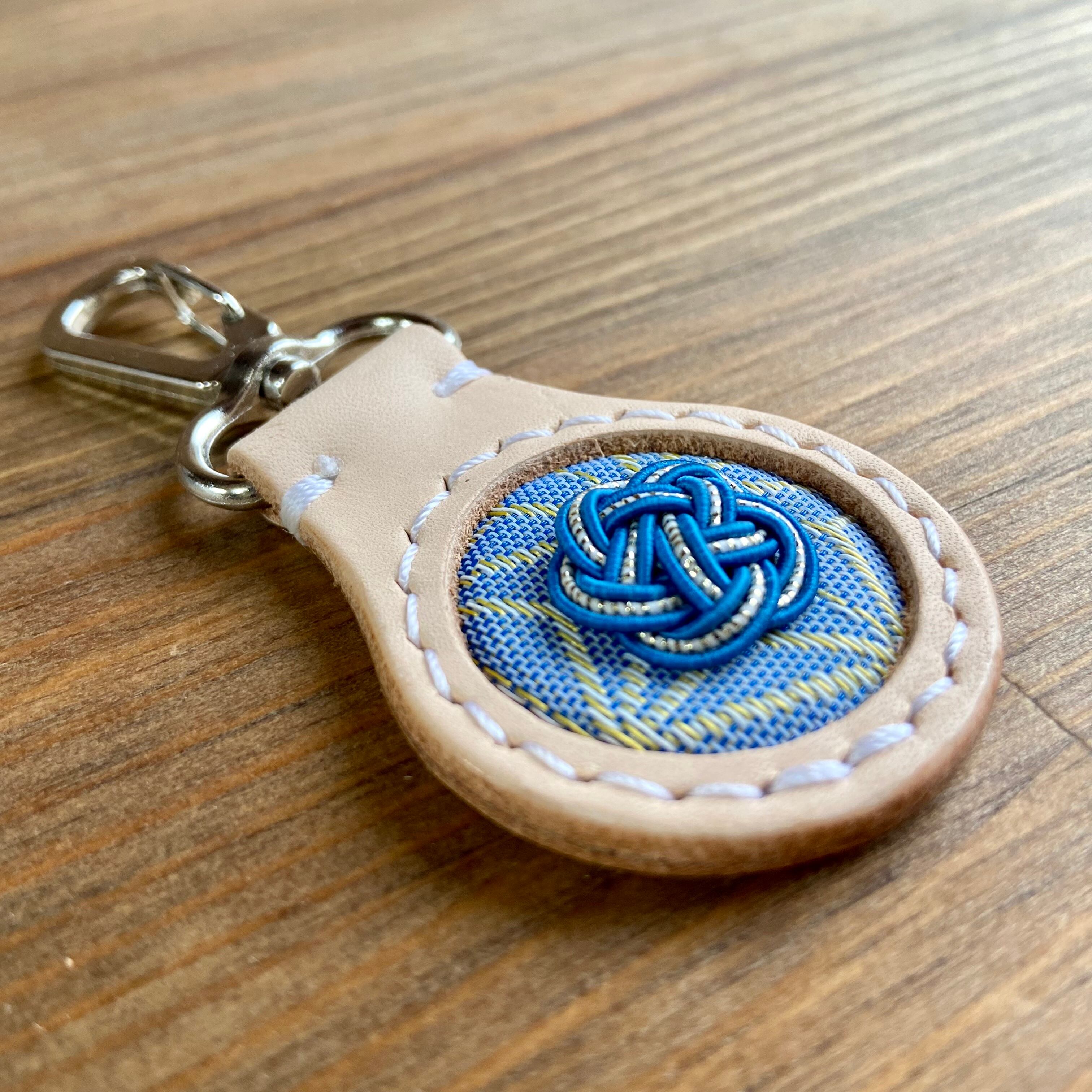 当工房の代表作【印鑑ケース】と同じ素材『姫路レザー×畳縁×水引』でお作りしたキーホルダーです。