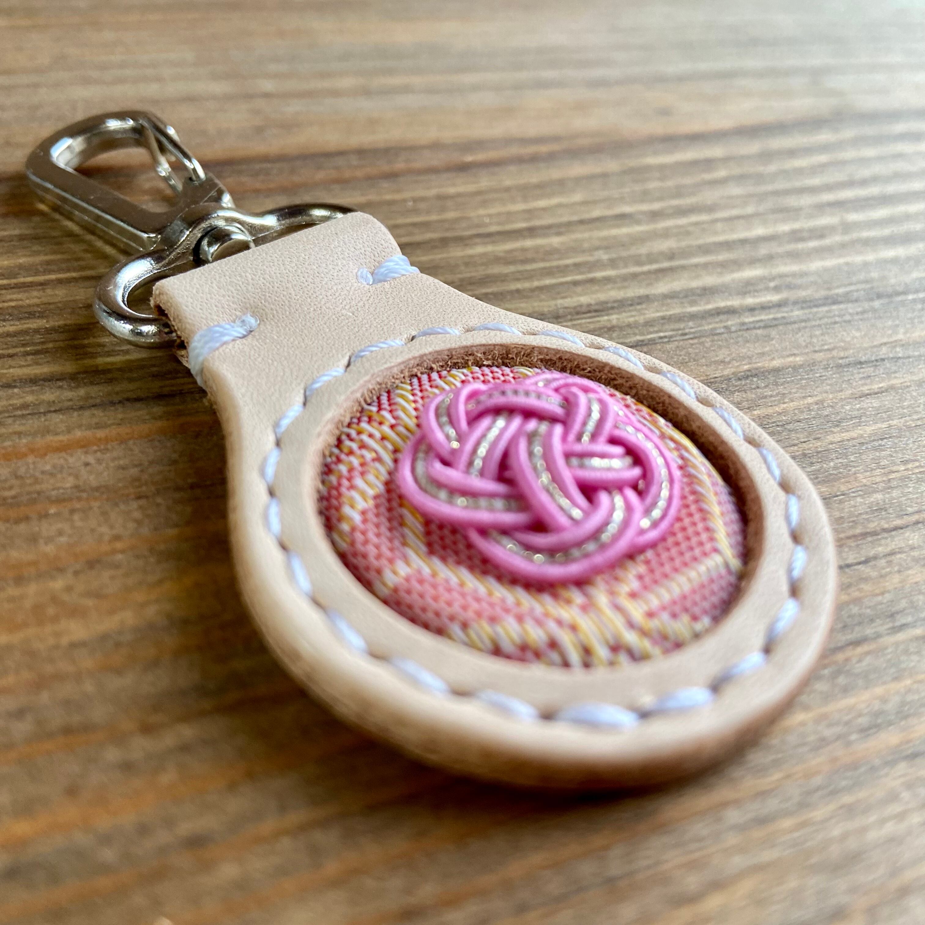 当工房の代表作【印鑑ケース】と同じ素材『姫路レザー×畳縁×水引』でお作りしたキーホルダーです。