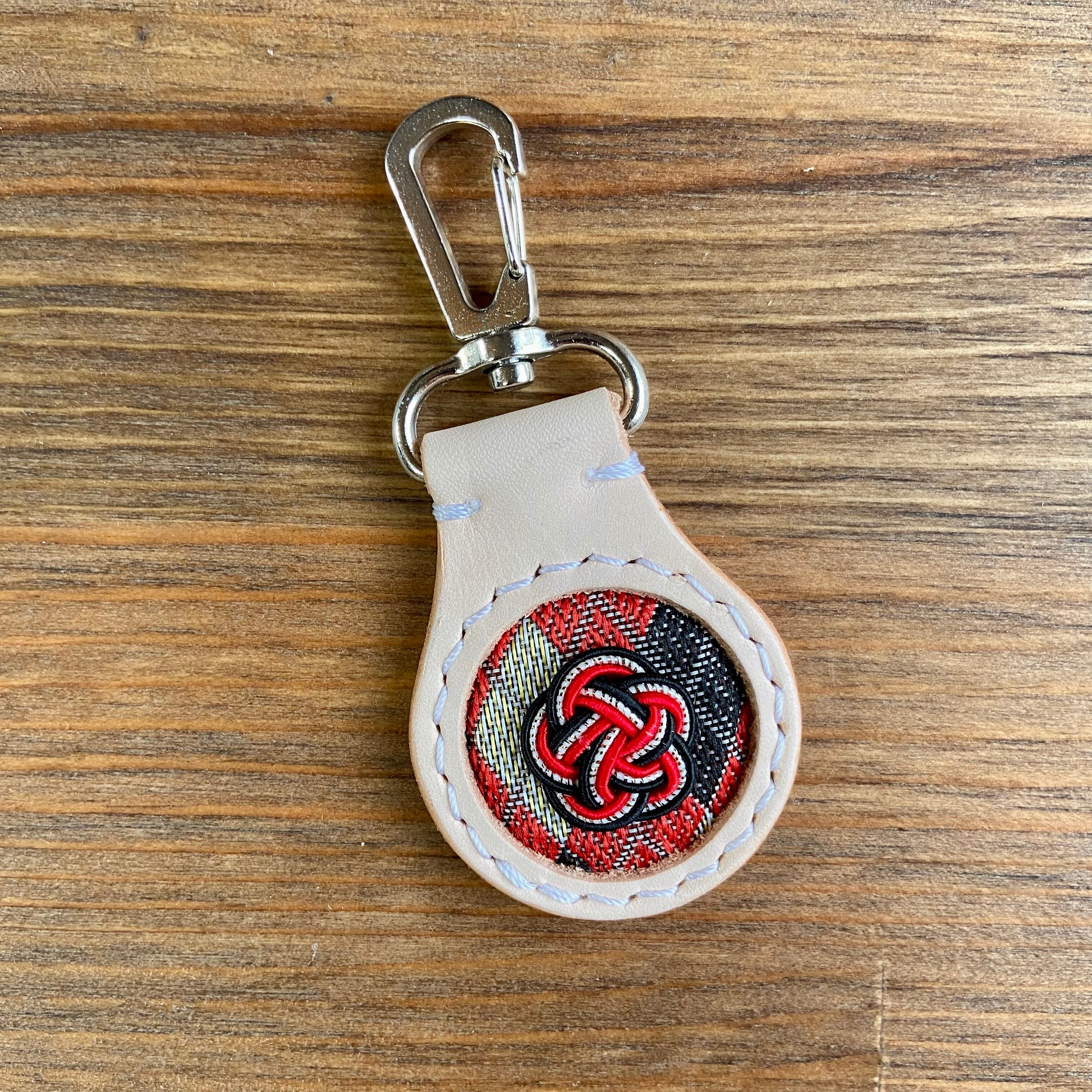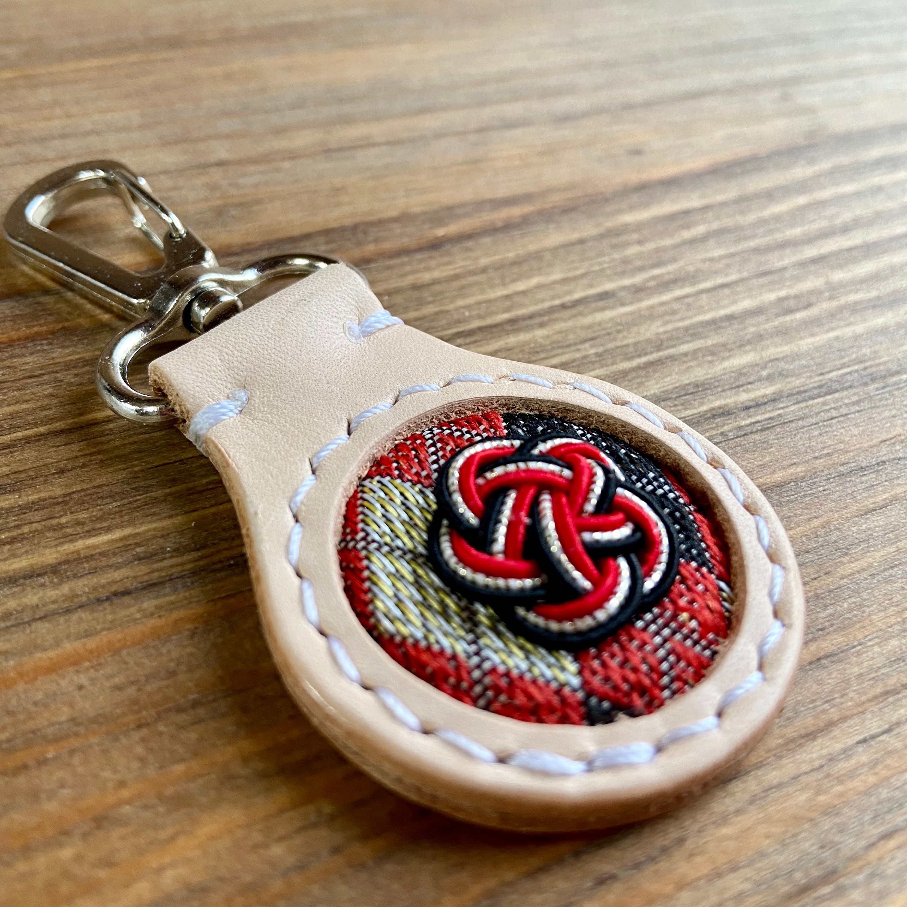 当工房の代表作【印鑑ケース】と同じ素材『姫路レザー×畳縁×水引』でお作りしたキーホルダーです。