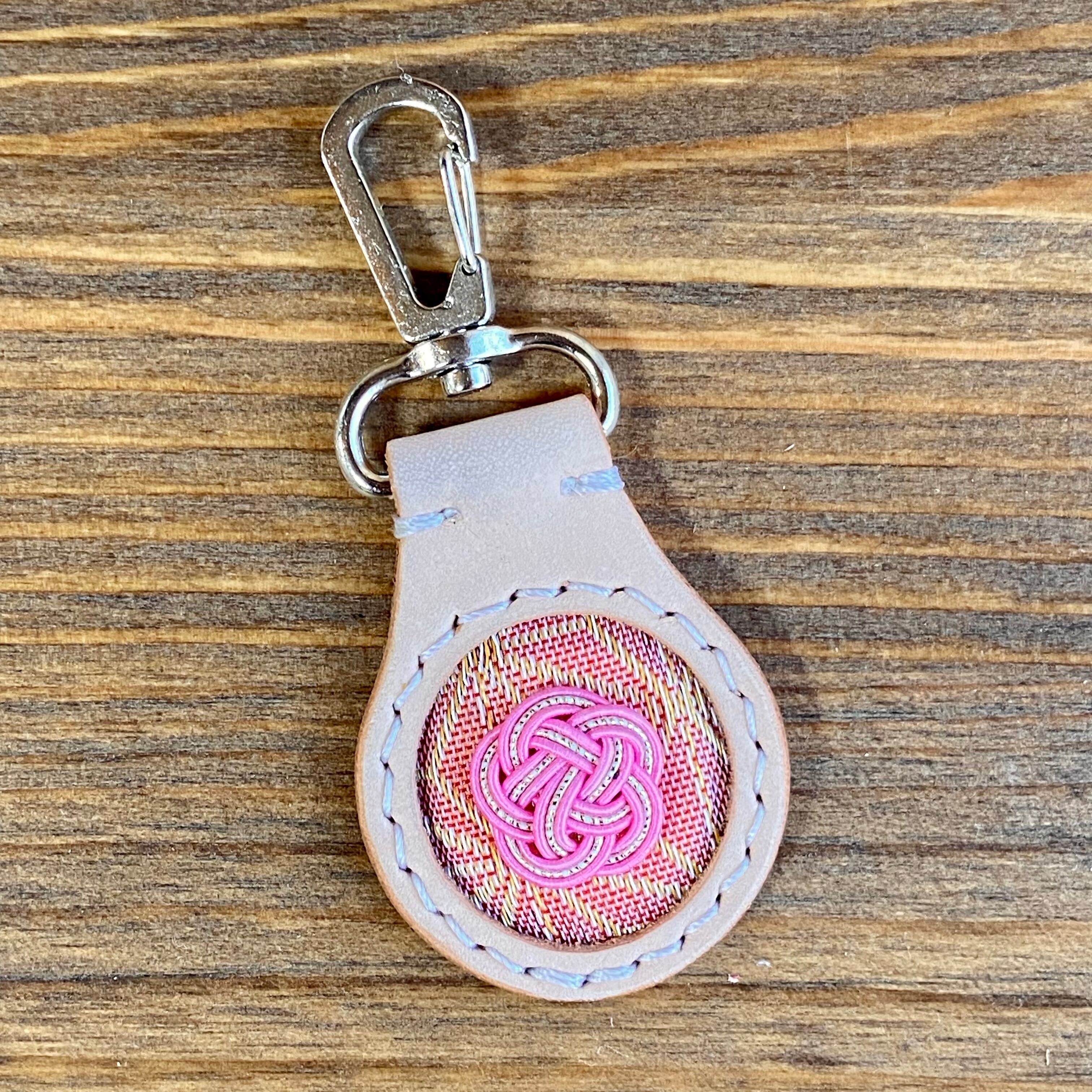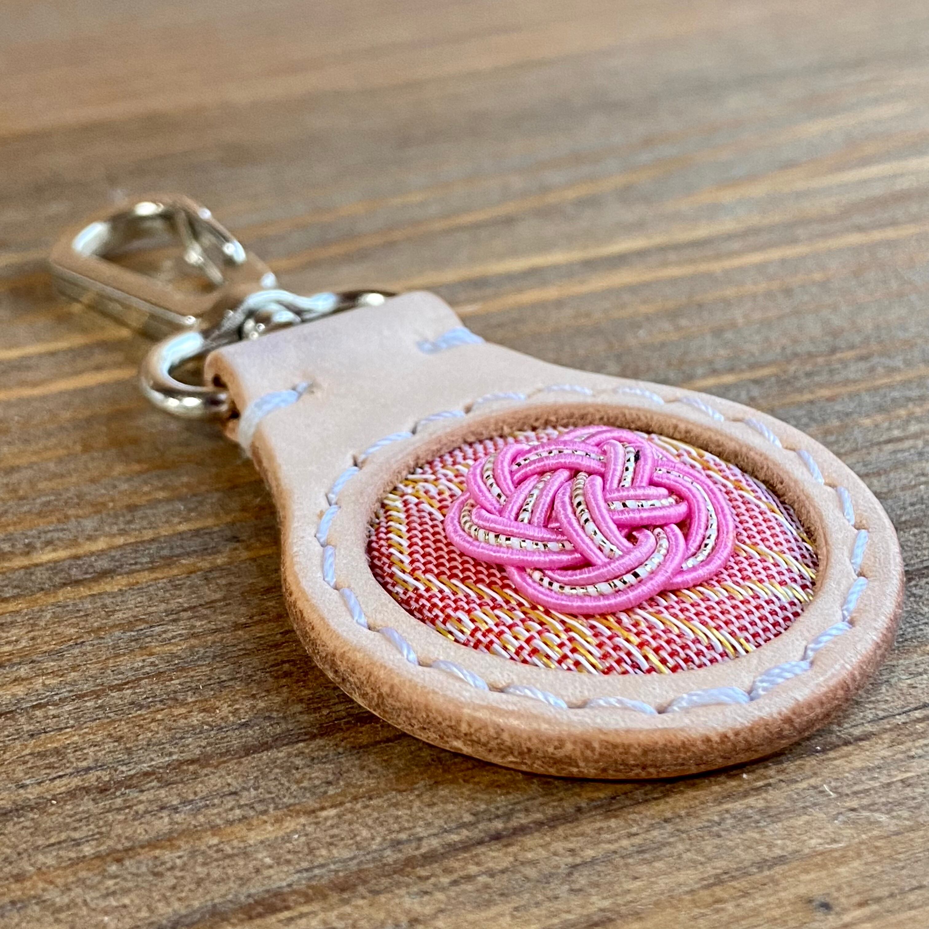 当工房の代表作【印鑑ケース】と同じ素材『姫路レザー×畳縁×水引』でお作りしたキーホルダーです。